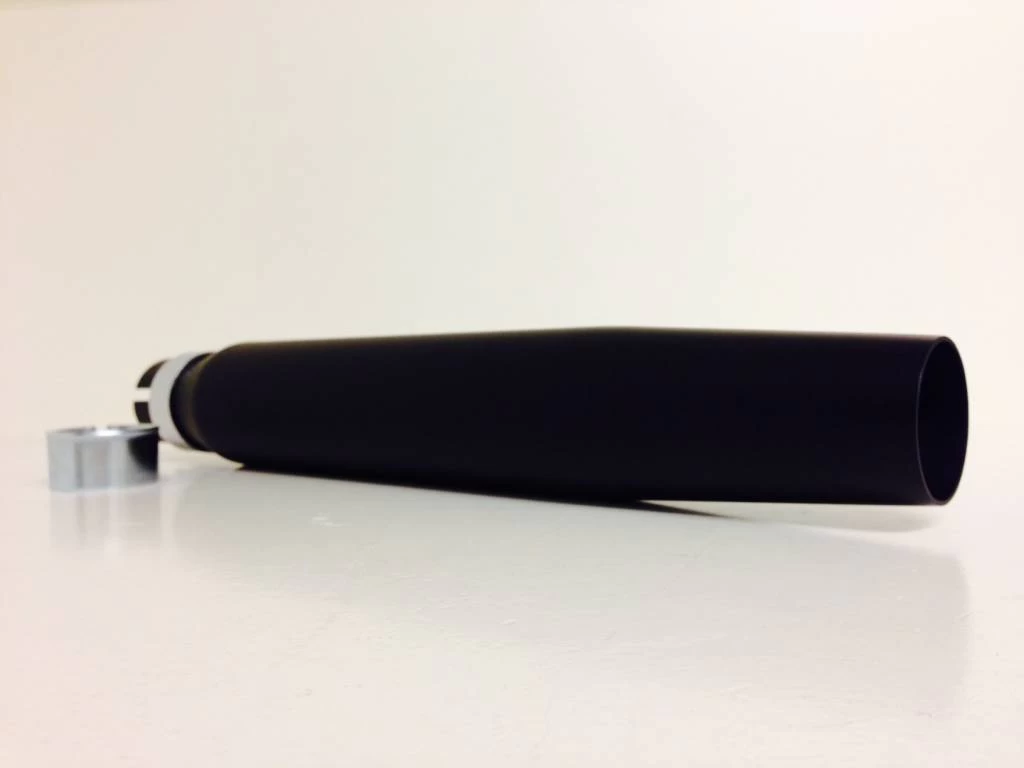 Tapered Black Universal Silencer. Pretty cool on a custom bike, but also seen on many Choppers, Scrambler and/or street tracker bikes as well.