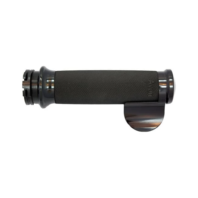 With Throttle Boss. USA manufactured from aluminum with 6061 billet aluminum end caps and collars. Kraton rubber is used for a soft serrated texture which offers a comfortable and slip-free grip that will not harden or stain your hands.