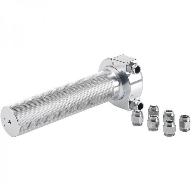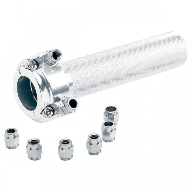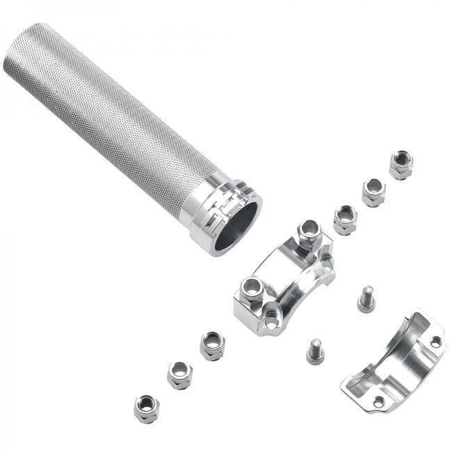 Construction: CNC-machined 6061 T-6 aluminium clamshell and throttle tube; chrome-plated steel cable ferrules; plated Allen cap clamshell mounting hardware.