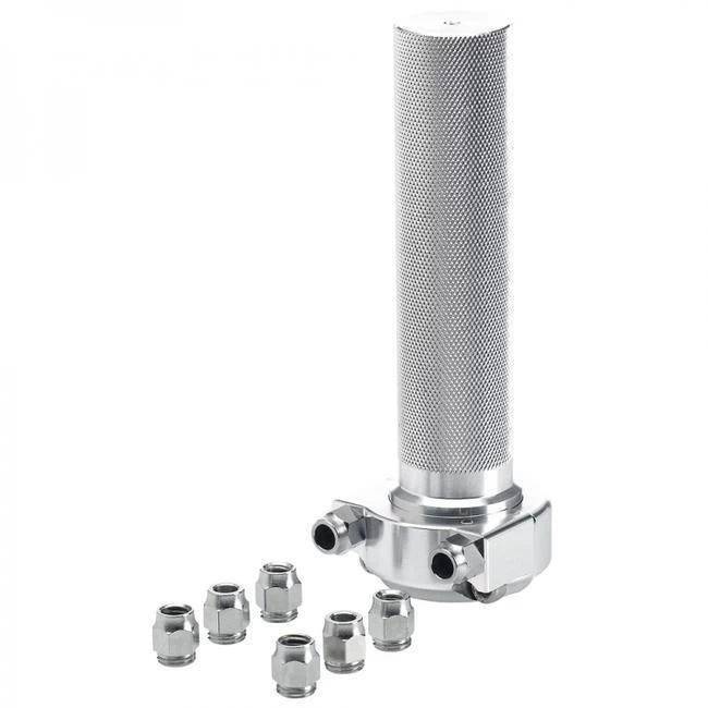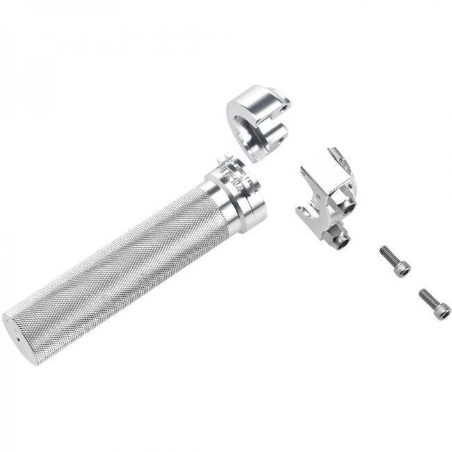 Fitment: Available in two styles: single cable for custom applications; dual cable for retro fitment on stock Harley-Davidson push/pull throttle cable assemblies. Cable ferrules included with both styles are designed to fit stock H-D thread-in and clip-in cables. Whiskey throttle grip tube is machined to accept rubber motorcycle grips (like our Kung Fu grips, for instance). Select aftermarket moulded throttle grips with integrated cable channel may fit our clamshell assembly, but we do not recommend making this modification unless you are a competent mechanic or trained professional—there are too many variables that are impossible to test for safety and performance.