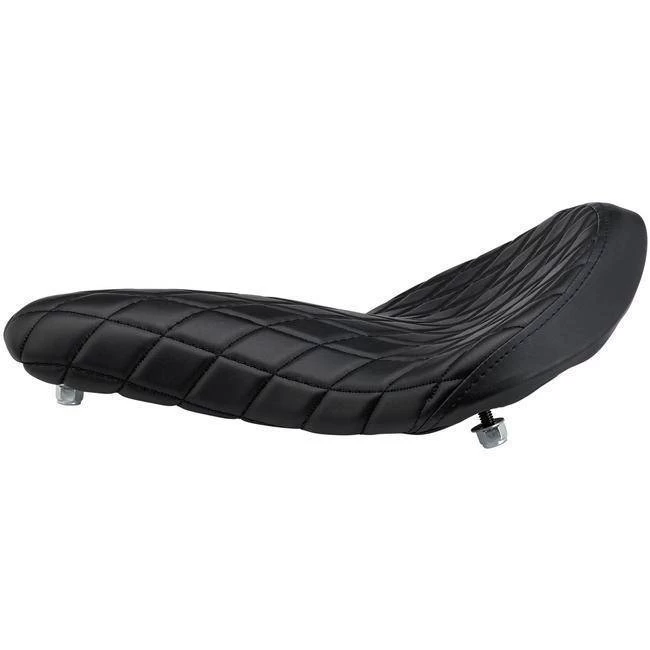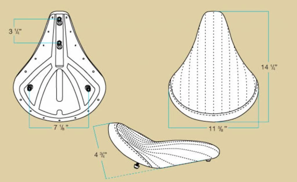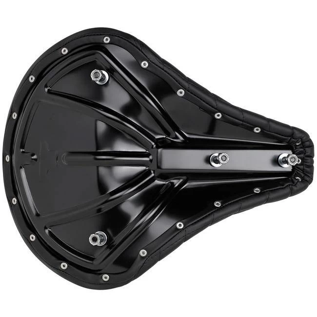 Construction: 1/8-inch thick (3mm) stamped steel pan with welded carriage bolts on nose and tail for spring and hinge mounting. One inch thick moulded polyurethane foam padding with a hand-stitched heavy-duty vinyl cover. Four carriage bolts are welded onto the bottom of the pan to facilitate spring and seat hinge mounting. Your frame may require modifications to nose hinge and spring bungs for proper fitment.
