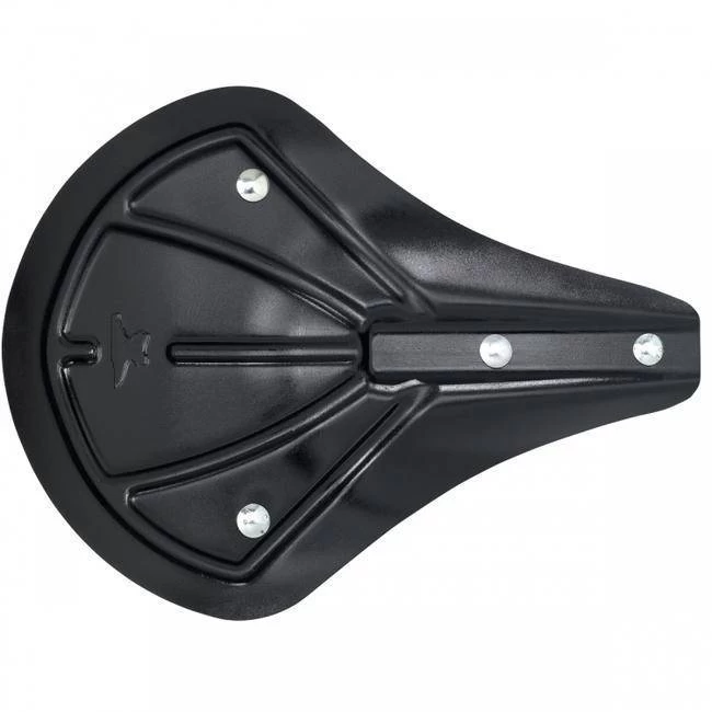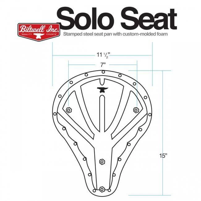 Construction: Heavy gauge stamped steel pan with gently sloping rear kick for added support. Stamped-in ridges on the pan increase stiffness and give the pan a clean, classic look. Matte black electroplated finish. Cover is hand stitched heavy-duty vinyl and is fastened to underside of seat pan with rivets for durability. Foam is molded polyurethane, approximately 1” thick.