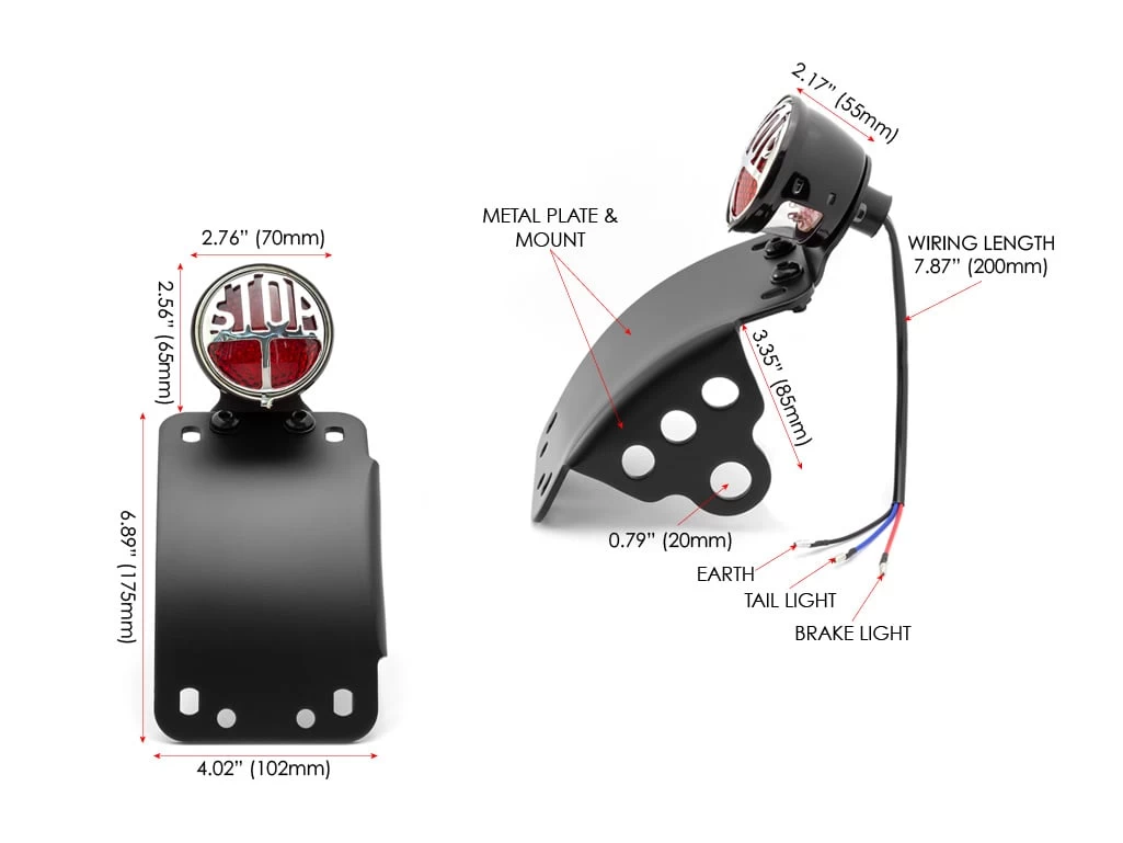 Good quality & solid side mount classic rear light with license plate bracket. The bracket mounts directly to your motorcycle rear axle and can be mounted to the left or right side of the motorcycle by simply flipping the plate over and undoing the nuts of the light and fitting it to the opposite side or the plate.