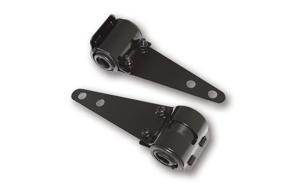 Universal headlight bracket, clack, with distance rubber, pair. For fork tubes from 30 to 38 mm. Arm length is 90 mm (centre of the hole). Clamp height 60 mm, mounting hole 10 mm.