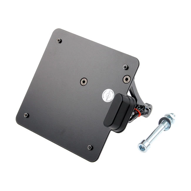 TUV certified. With 2-1 taillight/brake light and ECE-approved LED license plate light. P owder coated in semi-gloss black. S teel structure with fine laser cutting. Only when the license plate is illuminated. The ideal replacement for the standard side-mount, which is obtrusive. Gives off a sleek appearance by precisely fitting in the center of the standard fender. Installs using the provided hardware on the stock mounts. Combines with all sizes of license plates.