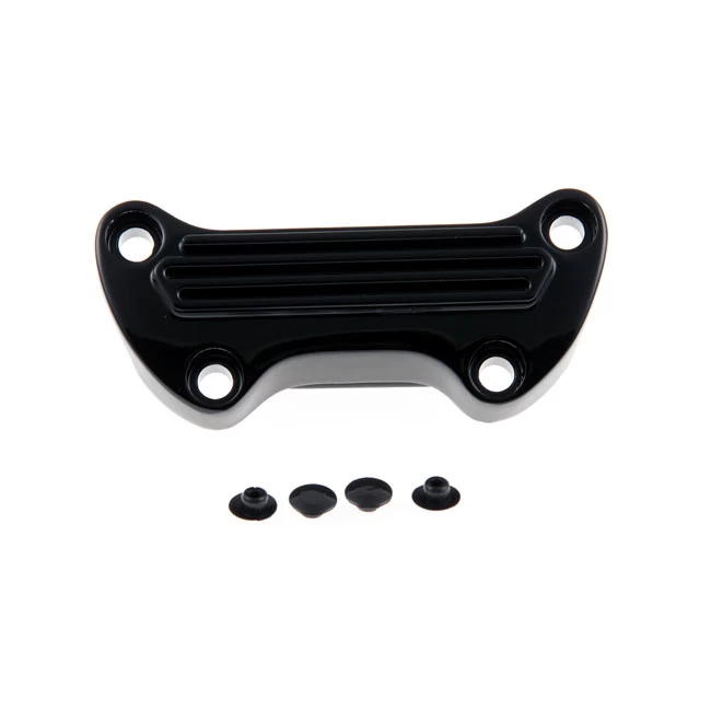Black powder coated finish. Fits OEM style straight and pullback risers as used on various 73-up Big Twin, Sportster (excl. FLT/Touring models) with a riser clamp area diameter of 1″/25.4mm., 3-1/2″ distance between riser mount bolts and offset top clamp bolts. Includes 4 allenhead screw covers for the finishing touch. Without skirt.