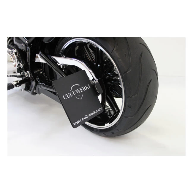 CNC-machined steel in a glossy black powder coat with an ECE-approved LED license plate light already mounted. Extra-short mount for installation near to the bike for an integrated appearance. contains all necessary installation hardware and mounts to the left side of the wheel axle. TüV certified. For brackets of the size 180 x 200mm (width x height).