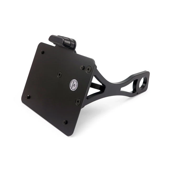 CNC-machined steel in a glossy black powder coat with an ECE-approved LED license plate light already mounted. Extra-short mount for installation near to the bike for an integrated appearance. contains all necessary installation hardware and mounts to the left side of the wheel axle. TüV certified. For plates measuring 210 x 130 mm (width x height).
