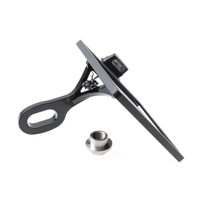 With a special slide-in frame for an easy ‘slide-in’ license plate installation. Gloss black powder coated CNC machined steel with pre-installed ECE approved LED license plate illumination. Extra short mount for a close-to-the-bike-installation for the integrated look. Mounts to left side wheel axle and includes all required installation hardware. TüV approved. For 180 x 200mm size plates (width x height).