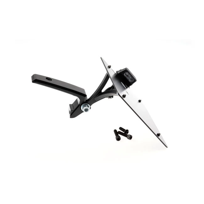 Gloss black powder coated CNC machined steel with an already-installed LED license plate light that has received ECE approval. For a close-to-the-bike installation and an integrated aesthetic, use an extra-short mount. The holder comes with all the necessary installation gear and is installed on the swingarm using a specific bracket. TüV endorsed. For mounts measuring 180 x 200mm (width x height).