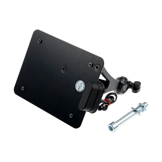 CNC-machined steel in a glossy black powder coat with an ECE-approved LED license plate light already mounted. contains the necessary longer shock mounting bolt and stainless license plate mount bolts, and it mounts to the left side lower shock mount. for brackets of the size 170 x 170mm (width x height).