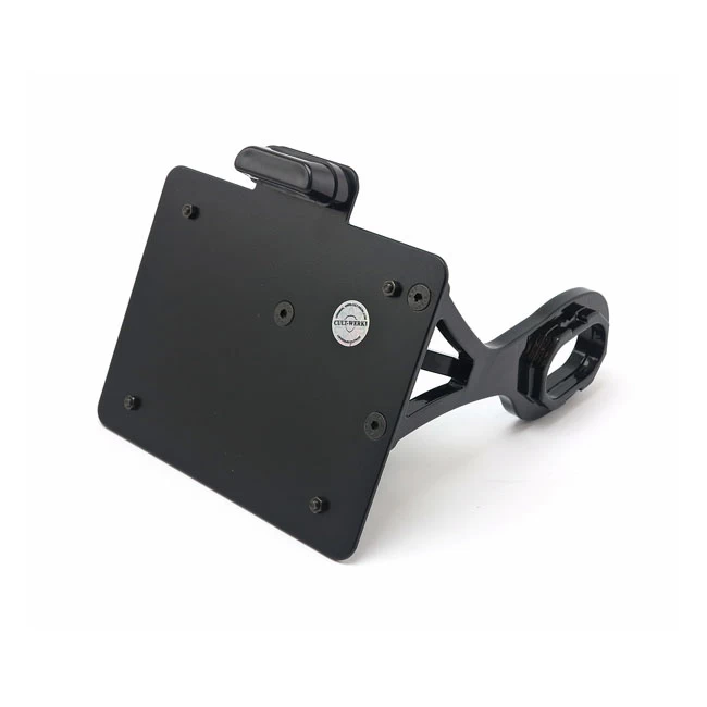 CNC-machined steel in a glossy black powder coat with an ECE-approved LED license plate light already mounted. Extra-short mount for installation near to the bike for an integrated appearance. The holder comes with all the necessary installation gear and is connected to the swingarm’s stock mounting points using a unique bracket. TüV certified. For mounts measuring 210 x 130mm (width x height).