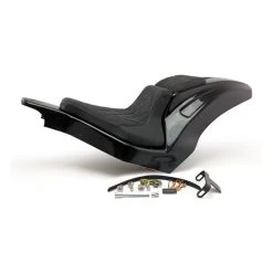 Perfect for installing a wider, up to 280 series, rear tire. Comes with a steel inner fender carrier, a sturdy 5-axis CNC machined ABS outer fender and a genuine leather seat. After the stock fender is removed the Racing steel fender is simply installed on the stock mounting points. Then wiring is installed and ABS outer fender is bolted to the inner fender. Permanent mods are not required. Gloss black powder coated finish. Complete with LED taillight, LED turn signals, seat and hardware. Note: Image shows a 280 series tire on a widened rim.