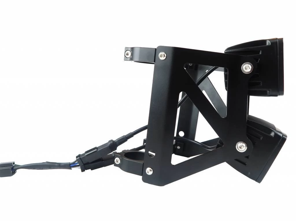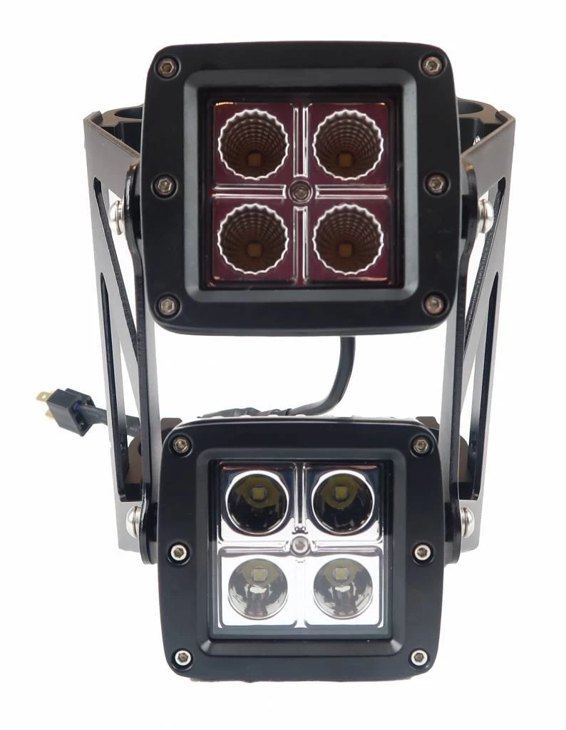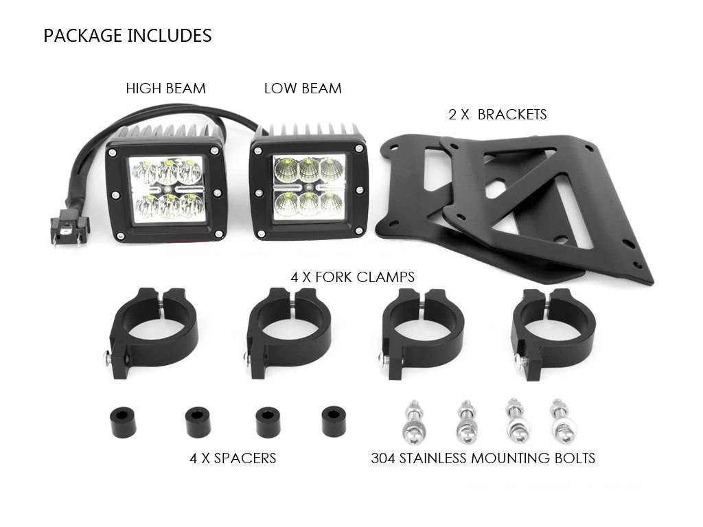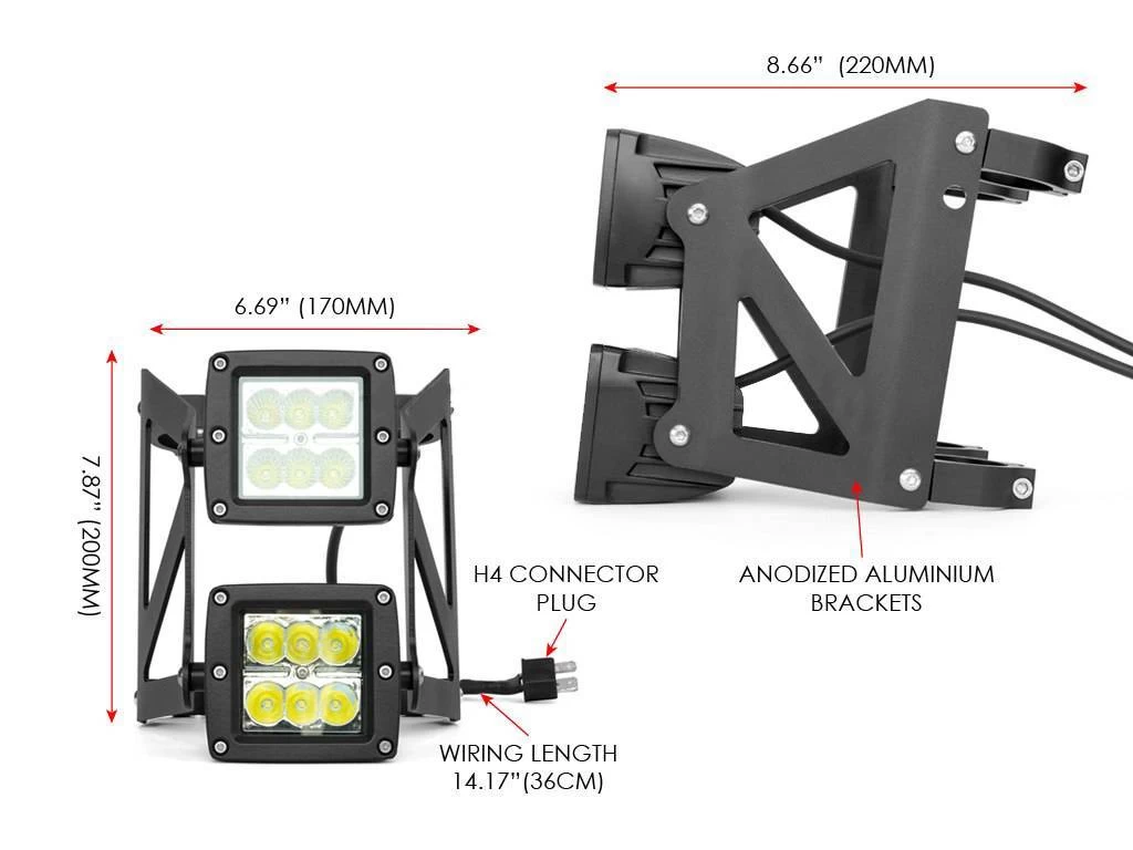 The lights consist of 2 x 20 watt LED cube lamps. The low beam is the upper light and the high beam one is at the bottom. The mounting bracket, which is supplied with the product, is made of anodised aluminium and has 4 fork brackets which fit easily on your front fork. A very unique and super bright headlight.