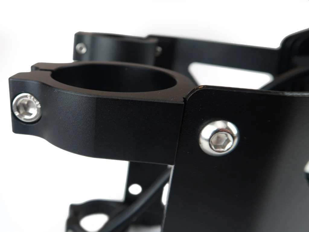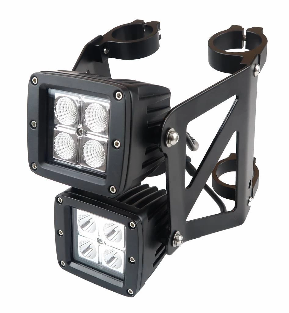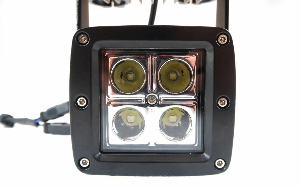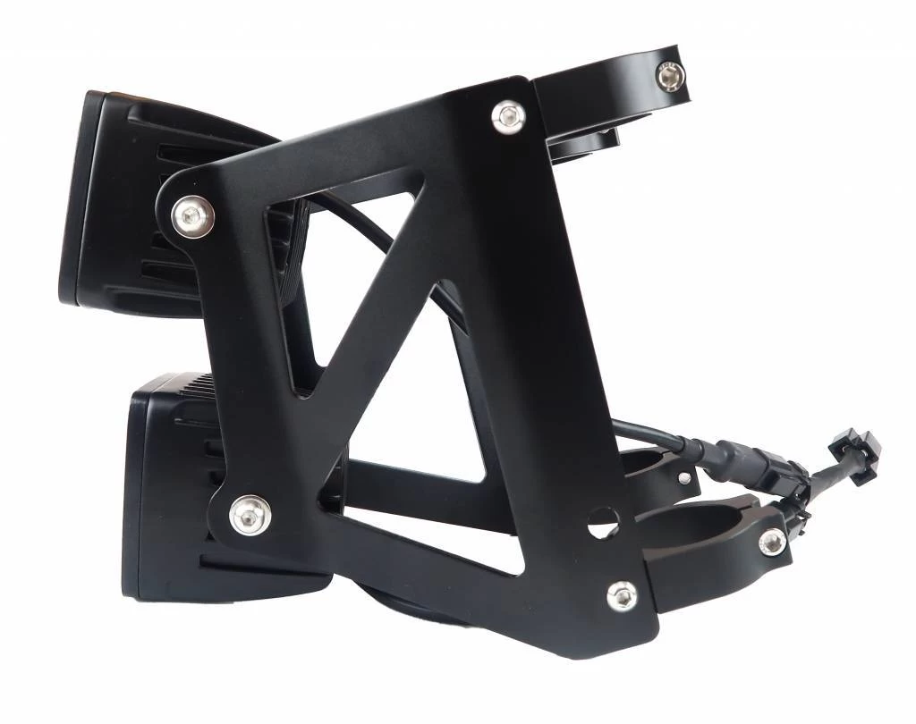 The lights consist of 2 x 20 watt LED cube lamps. The low beam is the upper light and the high beam one is at the bottom. The mounting bracket, which is supplied with the product, is made of anodised aluminium and has 4 fork brackets which fit easily on your front fork. A very unique and super bright headlight.