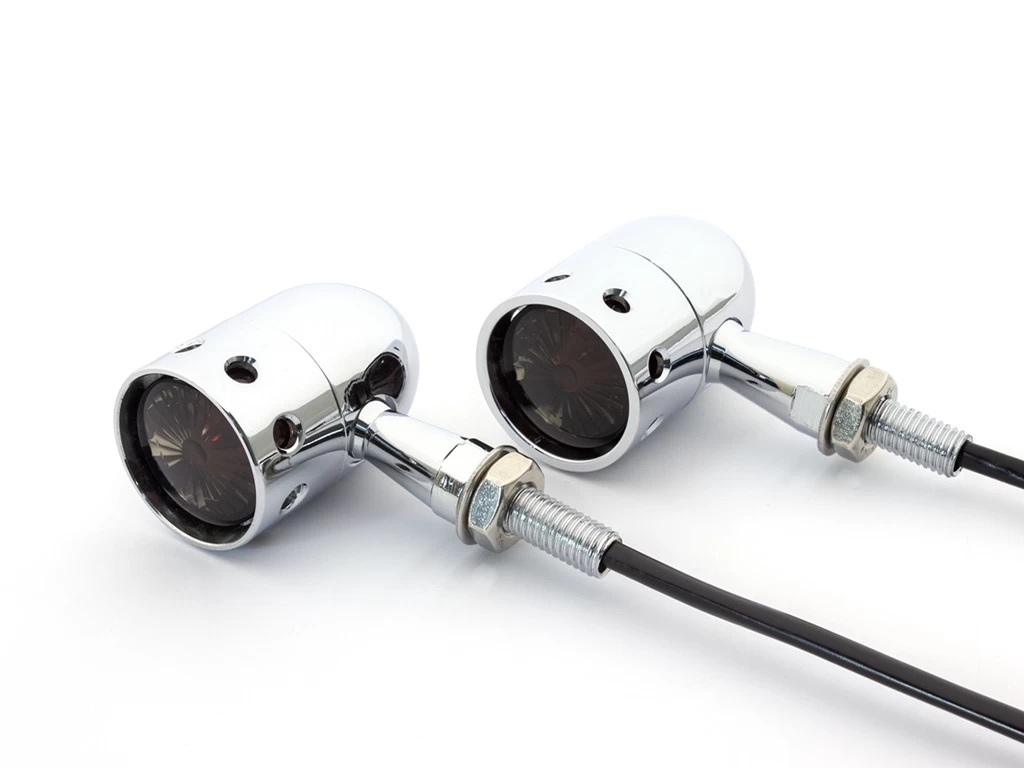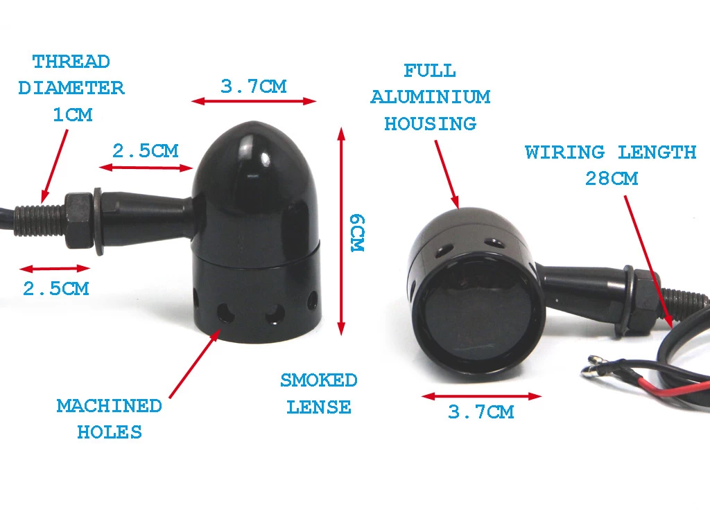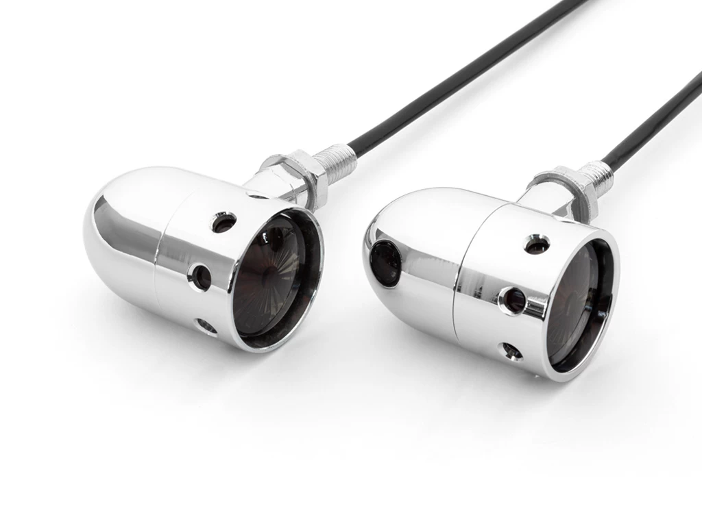 “Drilled” Aluminium Custom Turn Signals – Smoke Lens. These black Aluminium custom turn signal have a high quality and feature a classic & smoked lense.