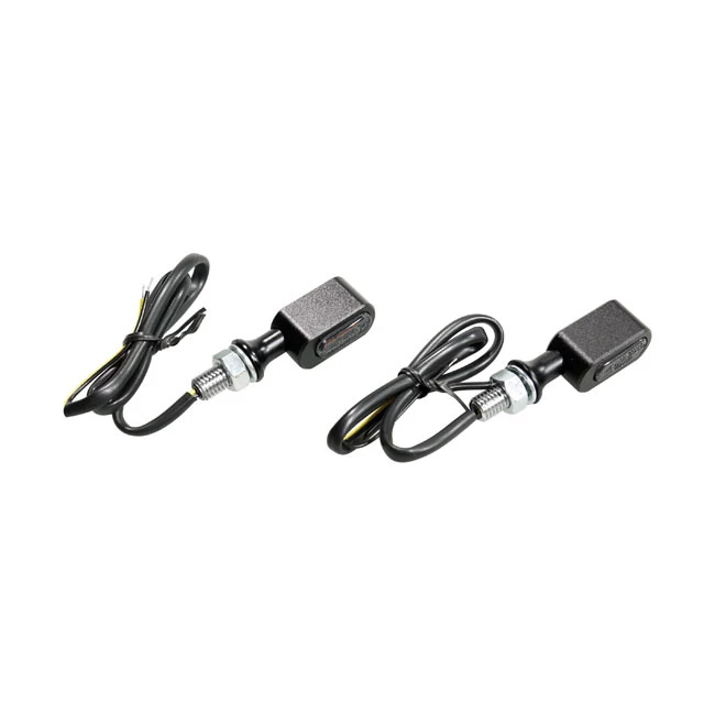 Mini turn signals with a ‘blend-in’ design that will style-merge with virtually any bike. Equipped with an ECE approved lens with single function High-Intensity amber LEDs. The billet aluminum housing measures 1″ (25.4mm) wide x 1/2″ (12.7mm) high. The stem is 14mm stem long. The threaded portion of the stem has 8mm threads and is 18.3mm long.