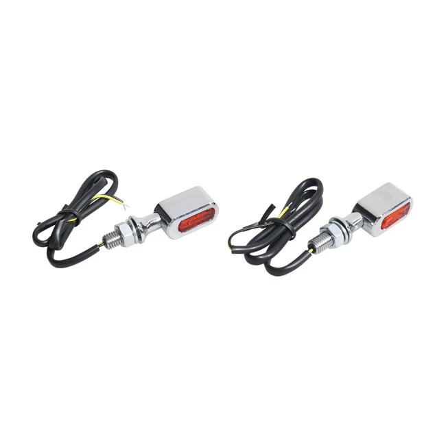 Mini turn signals with a ‘blend-in’ design that will style-merge with virtually any bike. Equipped with an ECE approved lens with single function High-Intensity amber LEDs. The billet aluminum housing measures 1″ (25.4mm) wide x 1/2″ (12.7mm) high. The stem is 14mm stem long. The threaded portion of the stem has 8mm threads and is 18.3mm long.