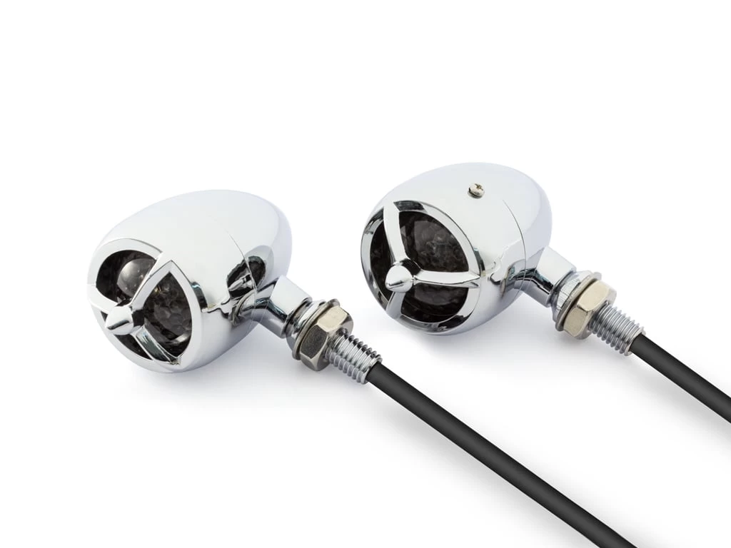 High quality handlebar turn signals, the housing is made of billet aluminum in different colors. The LED lamps radiate amber yellow (the legally required color).