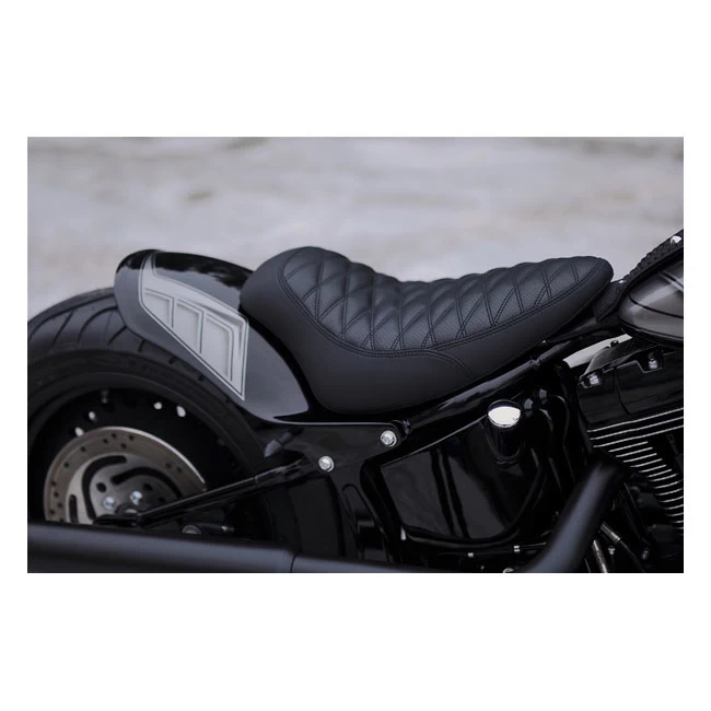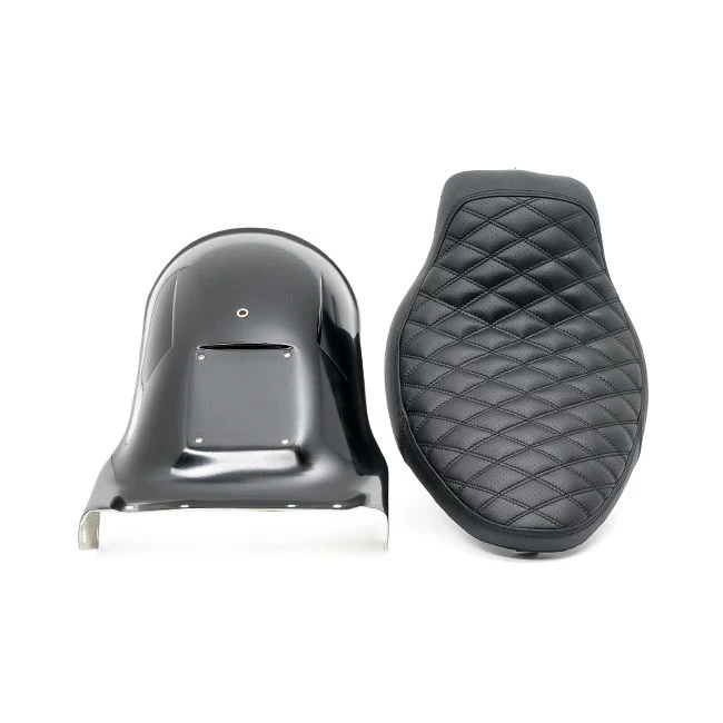 Hand-laid unpainted gel coated fiberglass rear fender that is stiff, strong and straight. Perfect for a short & aggressive solo look on a Softail. Fender comes complete with matching solo seat and a classic black perforated diamond stitched synthetic leather upholstery.