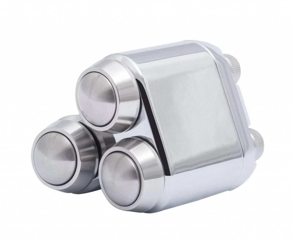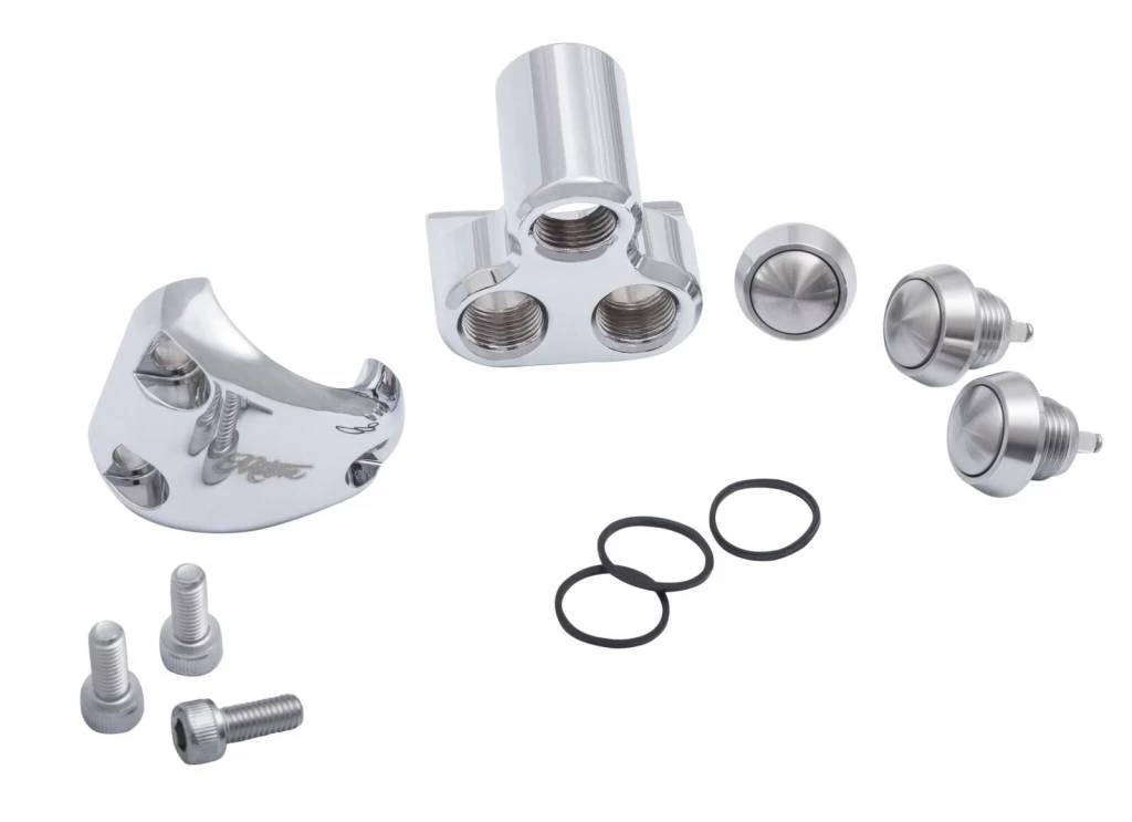 3 Button Switch 22MM or 7/8″ Chrome. This switch fits perfectly on a 7/8 inch bar and has 3 buttons. Very high quality and works perfectly with the M-Unit.