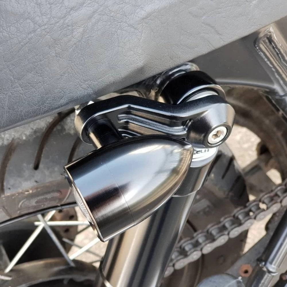 The brackets are designed to mount flush on the top eyelets of the rear shocks. At the other end of the bracket, there is a hole which will take the bolt from your turn signal (suitable for any size 8mm or 10mm thread both work fine)
