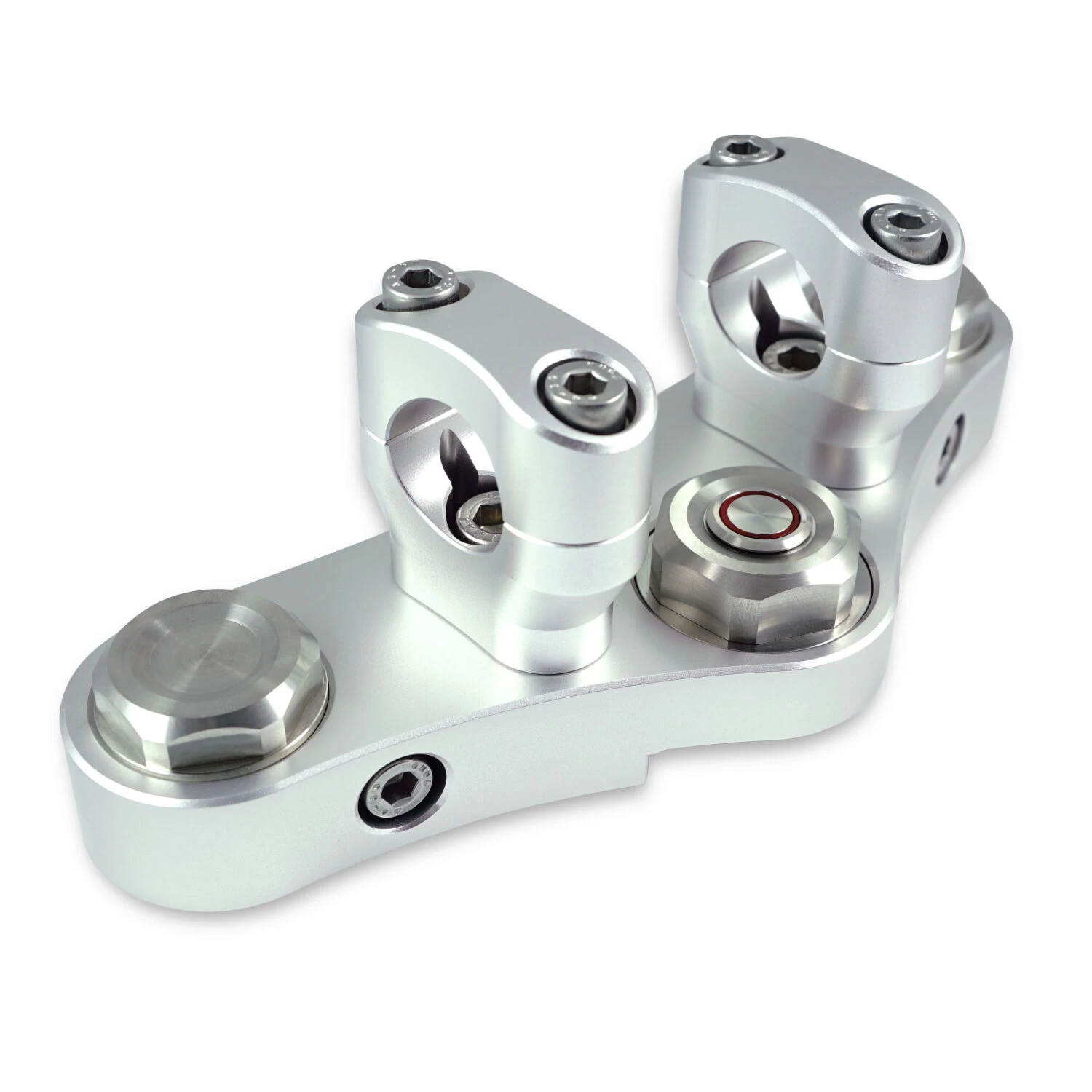 The risers are mounted to the triple tree using M10 stainless steel bolts, which of course are included. They can be used with our own Rebelmoto Triple Tree Clamps, and any other triple tree with 10mm mounting holes. The risers can also be used with the BMW 4mm OEM steel yoke. This requires a minor modification of the steel yoke to enlarge two of the mounting holes from 8mm to 10mm.