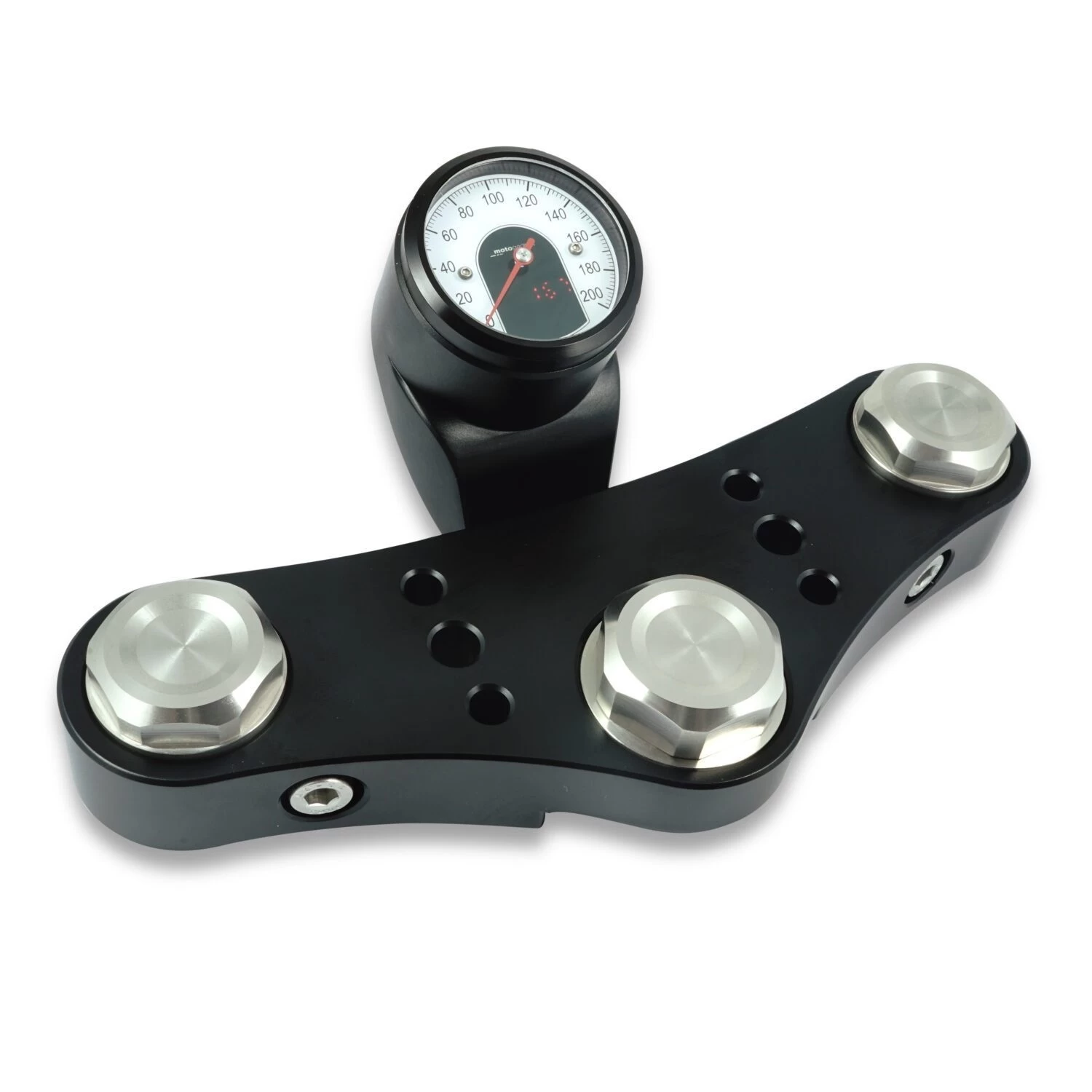The triple tree clamp has been designed to be used together with Motogadget´s series of Ø49mm speedometers. This includes the “Motoscope Tiny”, the “Mst Speedster” and the “Mst Vintage”.The speedo bracket fits perfectly on the rebelmoto Triple Tree Clamps, but can also be used with any other triple tree clamps, that have a spare M8 hole to mount it.