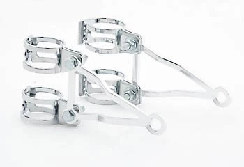 Polished Alu headlamp brackets with chromed clamps for the mounting on fork tubes. The set include 2 brackets and 4 chromed, two-part clamps. For forktubes from 55 to 58 mm diameter.