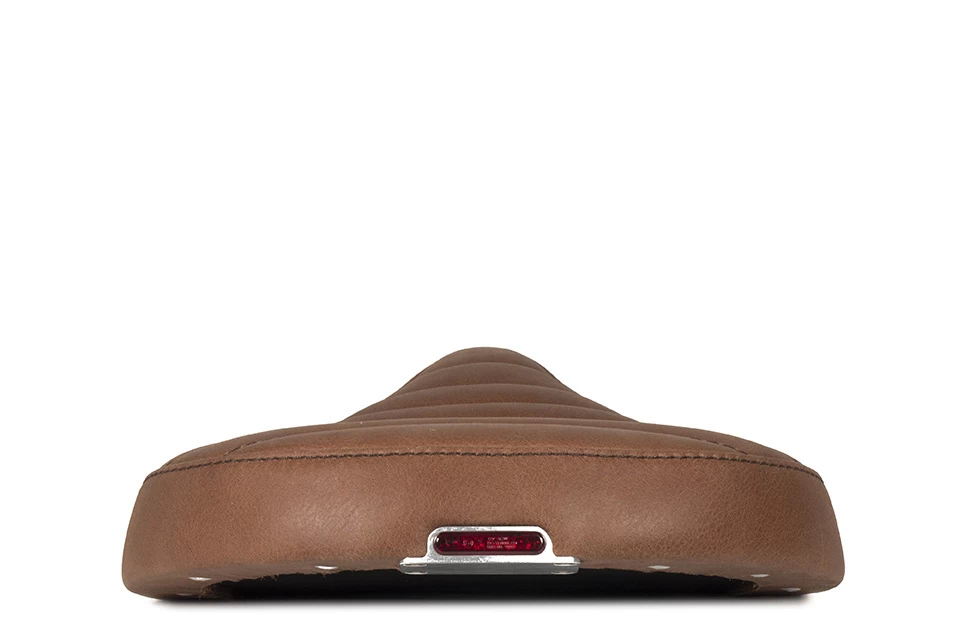 As far as we know this is the only ‚new school bobber seat with integrated LED rear- and brake light (with E-mark) and if it’s not the only one it definitely is the best looking one. The small and integrated light adds to a very clean look for your bike. The light measures 40×8 mm and is slotted in a custom designed CNC-machined alloy bracket that is bolted to the bottom of the seat, all wiring is internal and can easily be connected out of sight to your wire harness.