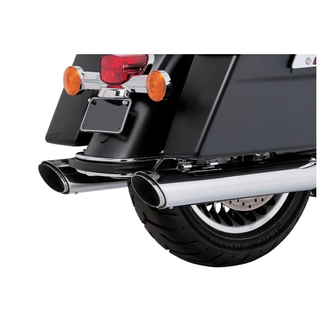 A classic with an edge, the Twin Slash Rounds feature large 4-inch muffler bodies with the V&H signature Twin Slash end treatment. Utilizing a maintenance-free baffle and minimized heat discoloration, the Twin Slash Rounds give you the perfect blend of past and present for years to come. The optional quiet insert for the baffle reduces sound levels 3-5 dB. Note: See 981033 for optional quiet baffle. Note: Will not fit Tri Glide or Street Glide trike models.