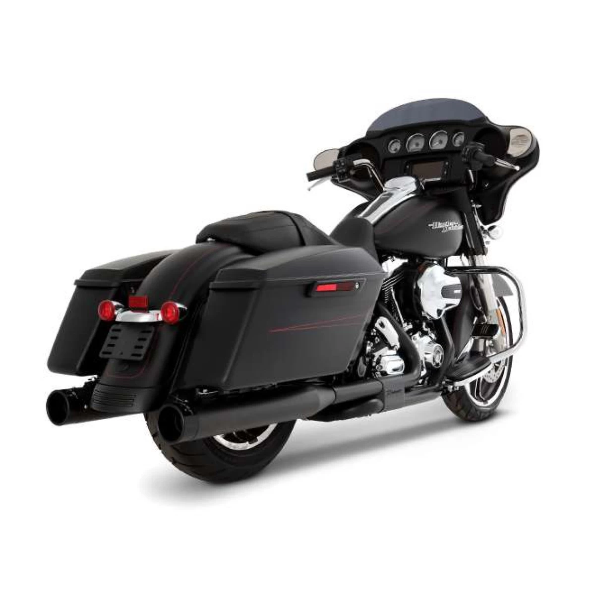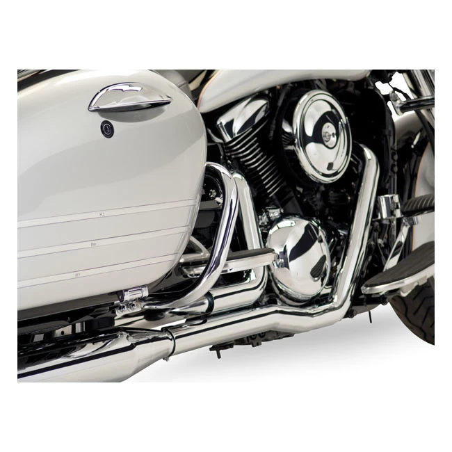 2-2 exhaust system with oversized mufflers featuring 220° full coverage. The full length head pipe heat shields virtually eliminate bluing for new looking, show quality pipes for many years to come. Baffles, mounting hardware and easy-to-understand instructions are included for a hassle-free perfect fit.